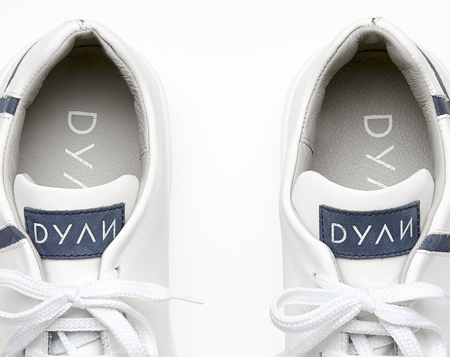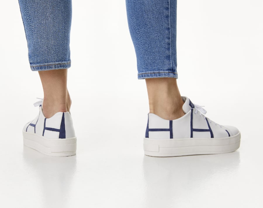 The great harmony of contrast and inverse forms. Distinct white leather with clever blue lines create a rectangular pattern that pulls your gaze. She is an eye-catching piece on one’s feet.